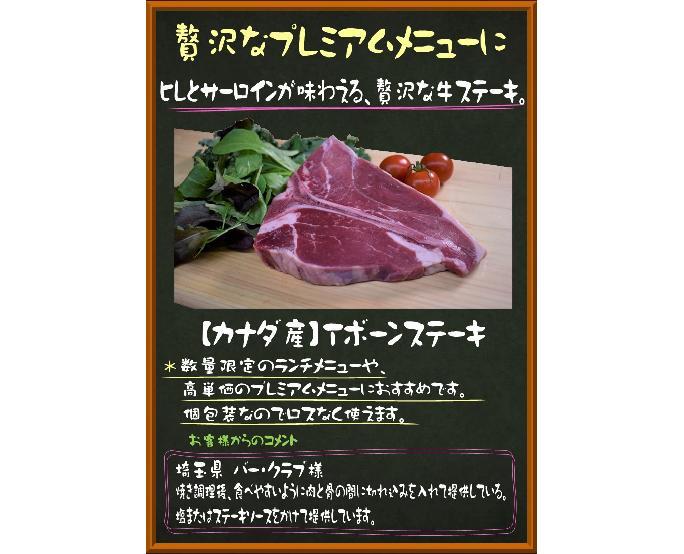 柔らかく、ジューシーなカナダ産仔牛のヒレとサーロインが楽しめるTボーンステーキです。熟成後、職人が1枚ずつスライス加工(厚さ2~2.5cm)しました。ロスの出ない個包装パックです。