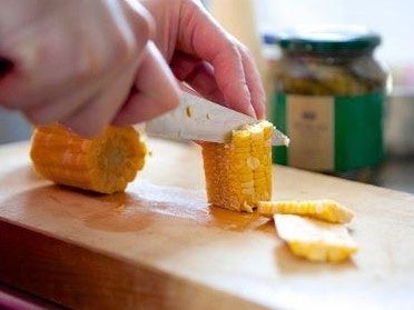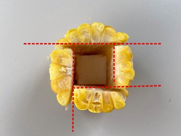 厨房でおこなうのと同じように、とうもろこしから4片を順に削ぎ切っています。
