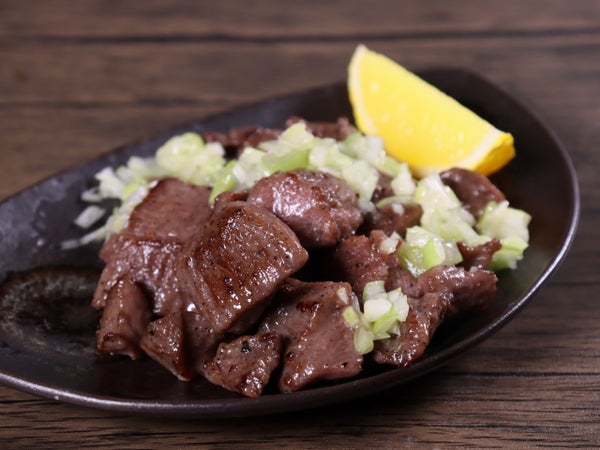 牛タンを一口サイズにカットし、調味液で軟らか加工し、下味程度に軽く味付けしました。お好みに応じて、ごま油・塩などで味付けしてください。