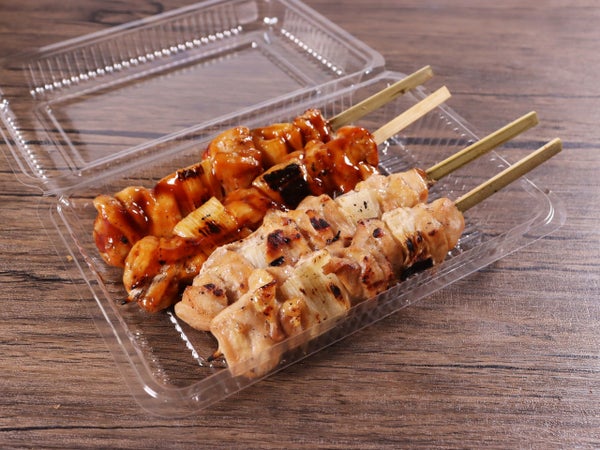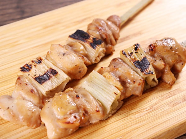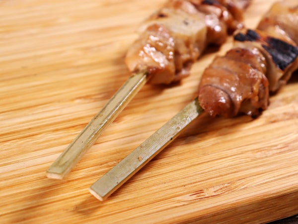 18cmの角串に刺した鶏ももと長ネギに軽く下味を付けて素焼きにしました。軽く温めてタレを塗れば、簡単に焼き鳥が提供できます。また、半焼けの心配もありません。