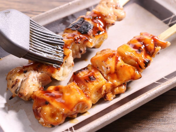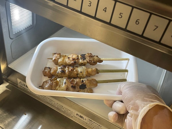下味を入れたあと串打ちし、スチームをかけて水分を閉じ込めました。炭火焼き工程を入れて香ばしい焼き色を付けています。