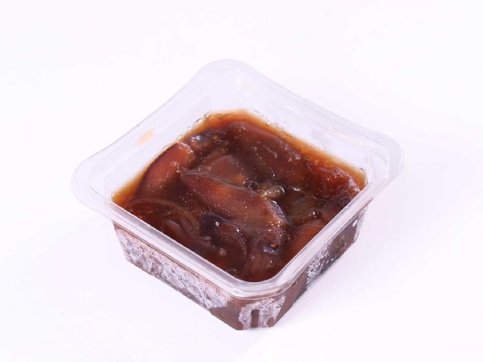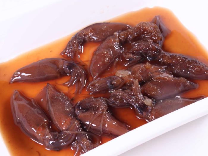 日本海産ホタルイカを甘辛い醤油ベースのタレで沖漬けにしました。鮮度を保つためにあえて目取りをしていないので、身にハリがあります。