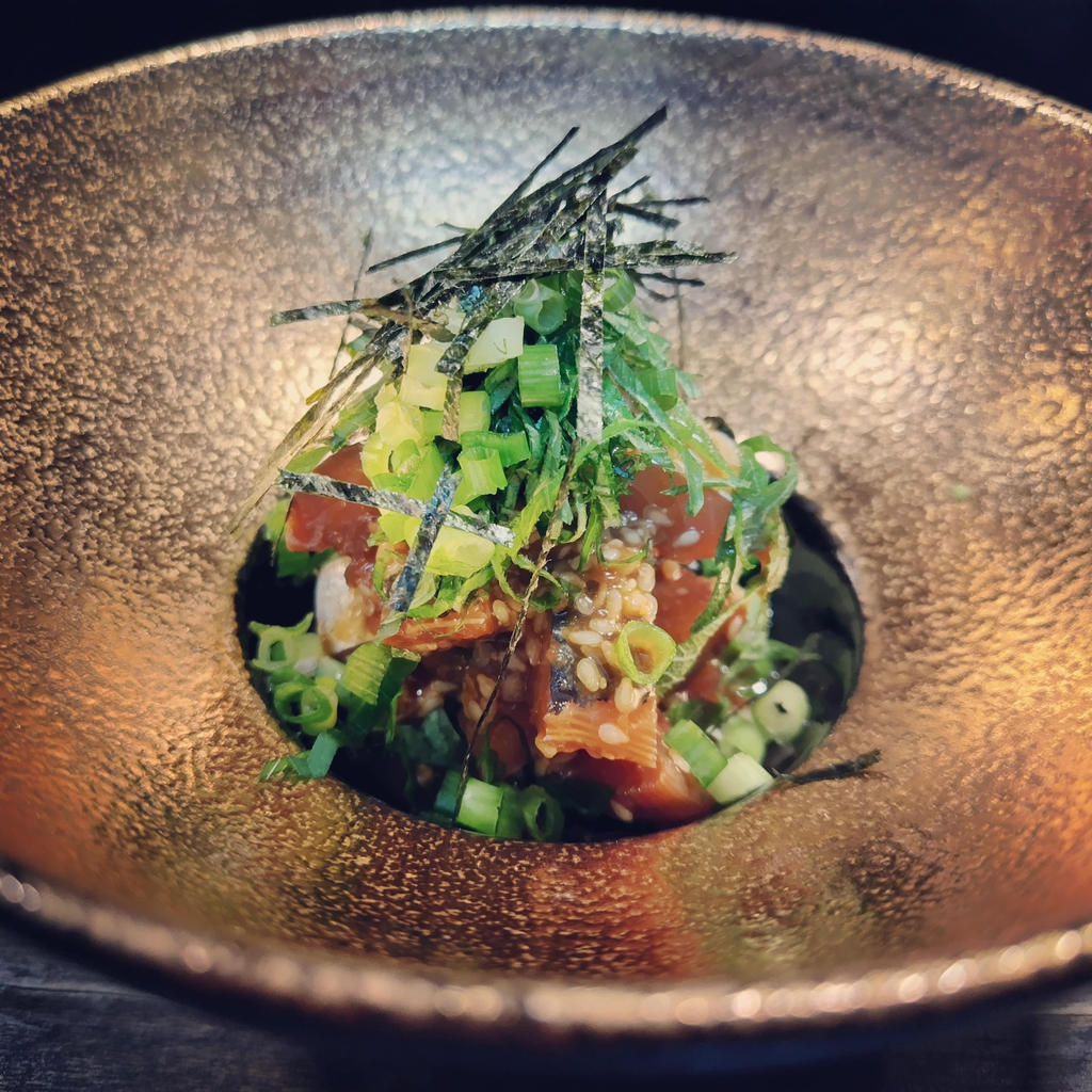 福岡の名物料理の1つ‘胡麻さば‘。おろし生姜、2種の胡麻の入った甘塩っぱいタレに、丁寧にカットしたノルウェー鯖を合わせました。ねぎやきざみ海苔と合わせて、おつまみにも、ランチなどの丼として併用できます。