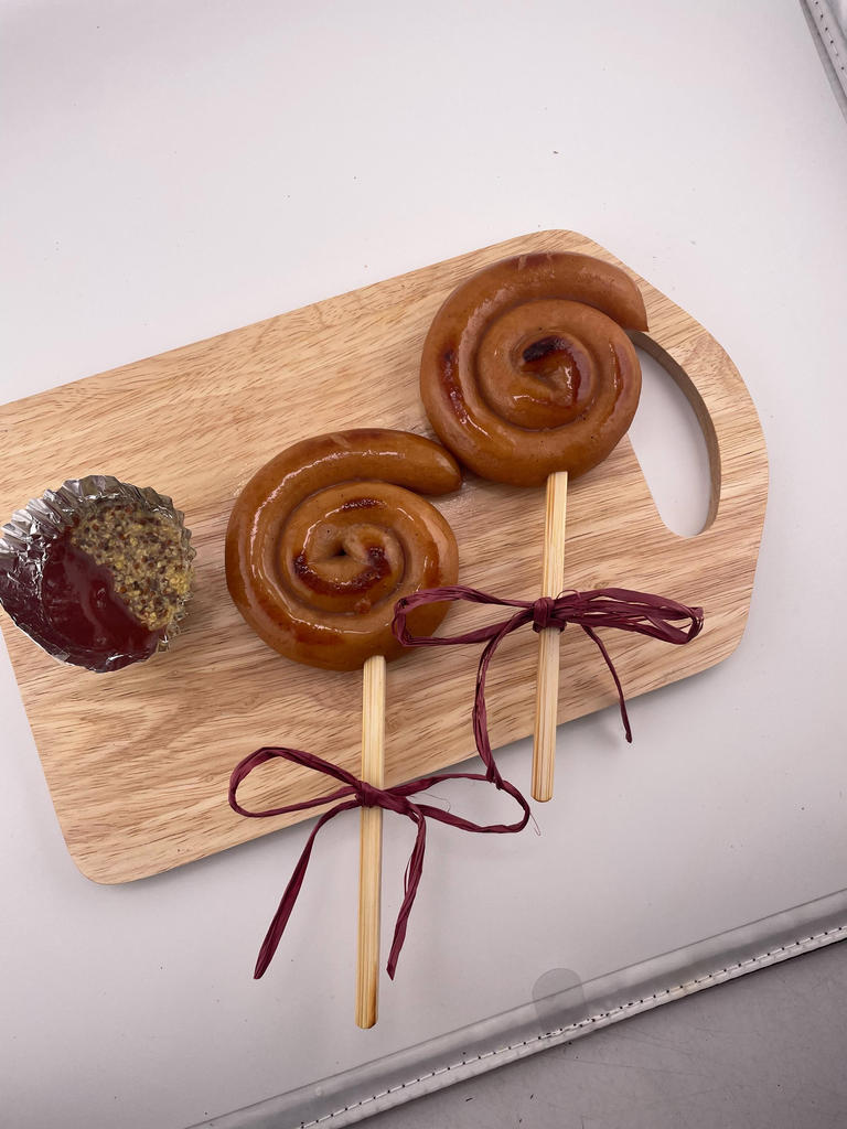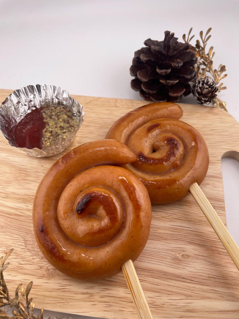 全長約25cmのロングウインナーを巻き、串に刺した見た目も楽しい串付きウインナーです。原料肉は豚肉のみを使用し、ジューシーに仕上げました。お祭りなどのイベントに最適です。