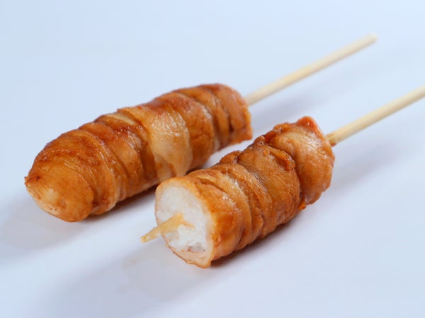 ご飯に豚肉を巻き、串に刺したおにぎり棒です。ご飯と相性の良いタレで味付けし、焼き上げました。温めるだけで簡単に提供ができます。お祭りなどのイベントに最適です。