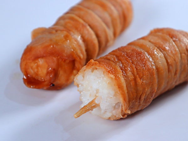 可食部は長10cm、直径は約3cm。少し細い分、ごはんに対して巻き付けた豚肉をたっぷり感じます。甘めのたれがおいしい。