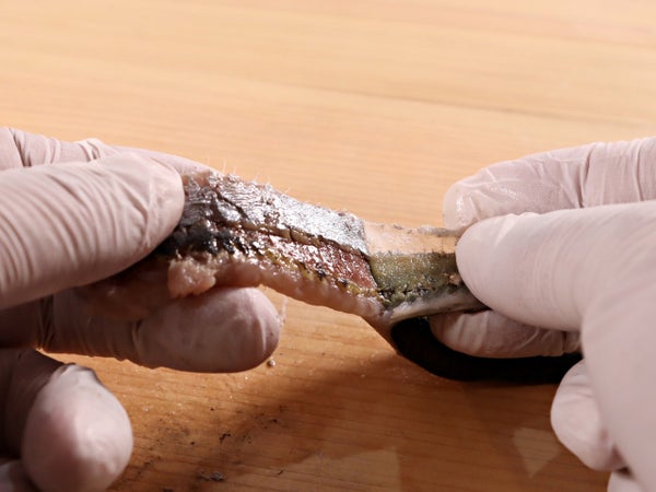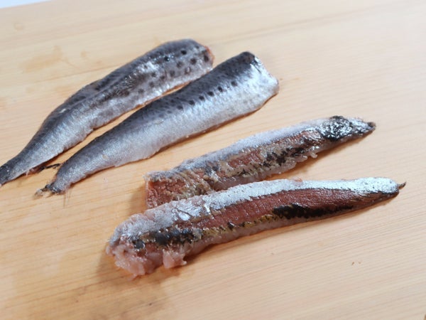 薄皮が口に残る場合は、頭側から身を抑えて手で剥いでからお使いください。皮を取ると酸味が柔らかくなります。