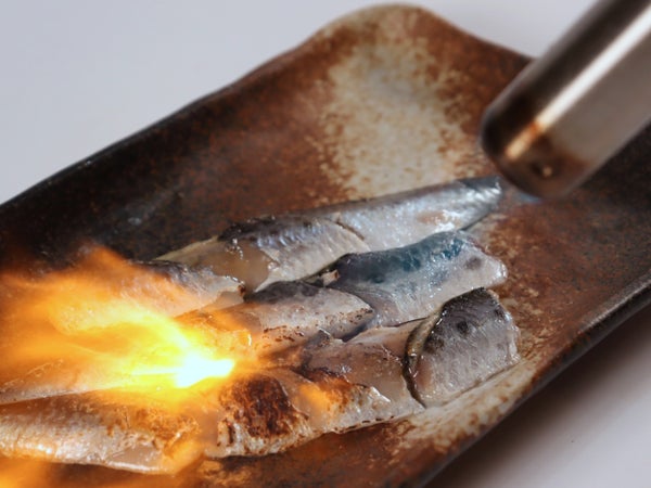 炙り締めいわしも、脂の甘みが増しておすすめです。小さい魚なので炙りすぎにはご注意ください。