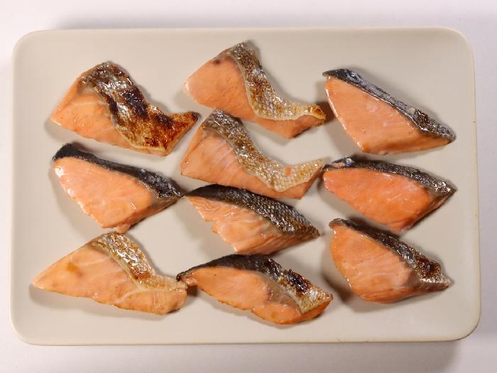 旨味を出すようにしっとり焼き上げた鮭の塩焼です。解凍だけで使え、おにぎりやお茶漬け、お弁当などに便利です。