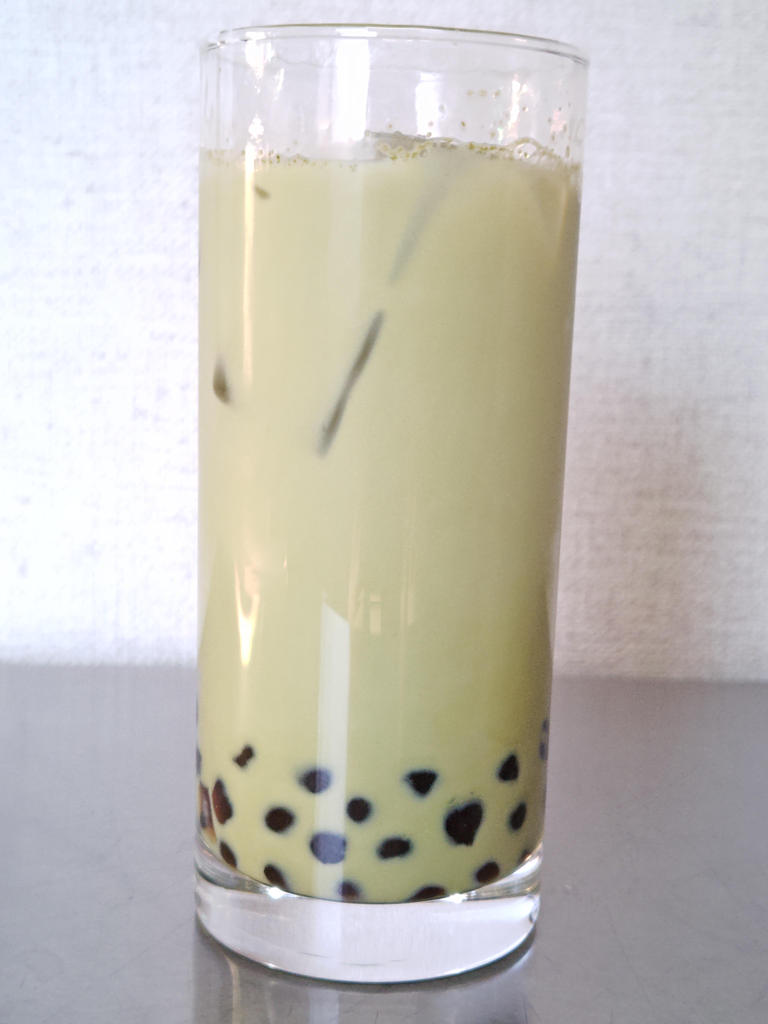 試作の写真ですみません。 個食パックの為、注文毎にレンジ加熱できるのでロスがないのがありがたいです。 氷のグラスに入れて撹拌して冷まし、牛乳を入れれば完成。グラスのサイズに合わせて氷の数で調整して、太いストローで提供しています。 甘さも丁度良く美味しいです。抹茶とタピオカコントラストも綺麗です。 リピートさせていただきたいです。