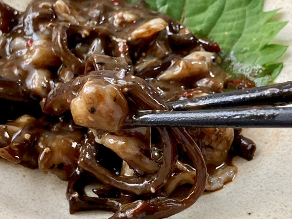 【調味液を落としてみました】タラ胃のコリコリときくらげのコリコリ。調味液の味の変化を感じるまで噛みしめさせてくれる、ほどよいカットです。