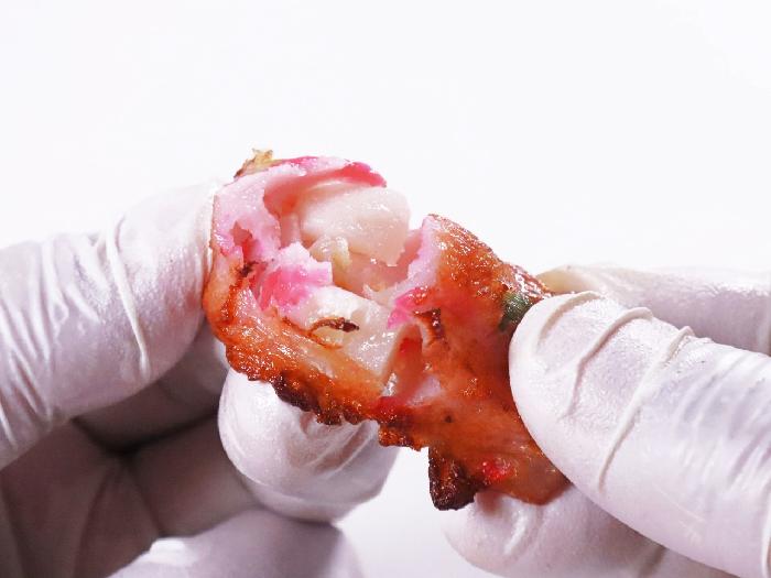 キャベツ(日本又は中国)、魚肉、紅生姜、蓮根、ねぎ、玉ねぎ、澱粉、大豆蛋白、植物油、食塩、砂糖、魚介エキス/ソルビトール、加工澱粉、調味料(アミノ酸等)、pH調整剤、酸味料、着色料(赤3)、(一部に卵・小麦・大豆を含む)