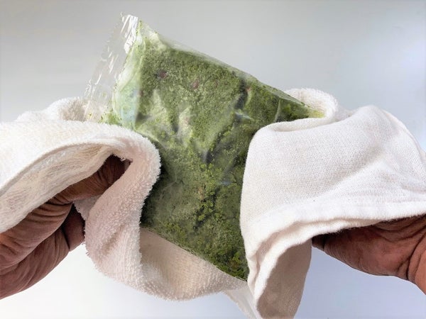 氷をもみほぐします。溶けないように素手で触らず、手早く。