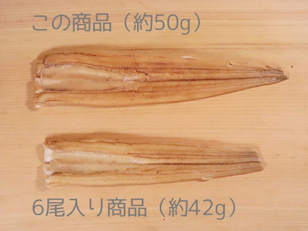 6尾入り商品(約42g)と比べて、大きく厚いあなごです。(2025年6月現在のラインナップです)