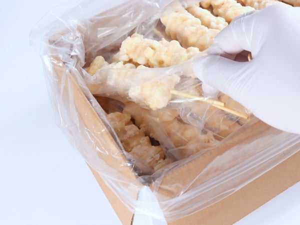 中国産のぼんちり肉を15cm串で6~7個刺してスチーム加工しました。現地加工したものを輸入しています。