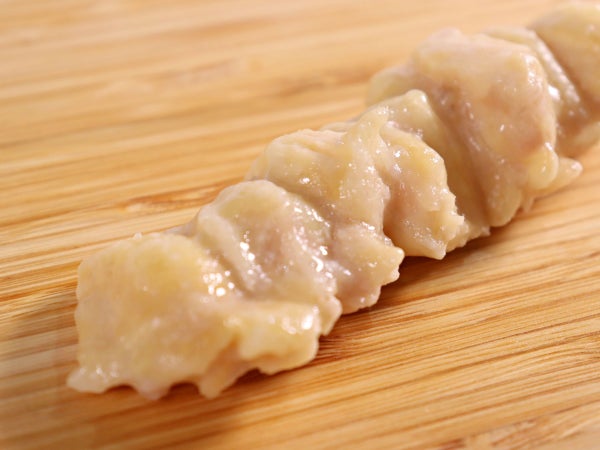 ぼんちりを柔らか加工後、串に刺してスチームしました。余計な脂が落ちて焼きやすく、生焼けの心配もありません。柔らか加工をしてあるので冷めても固くなりにくいです。