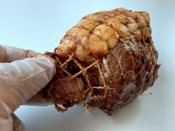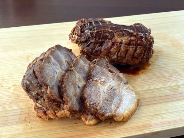 ネットで締めていますが固くなく、肉のほぐれ感もある肩ロースチャーシューです。 小ブロックなので、薄いスライスを何枚も切り出すのにはあまり向きません。大胆にスライスして端っこの部分も含めて提供したり、スライスではなく全体を刻んで使ったりするのがいいでしょう。