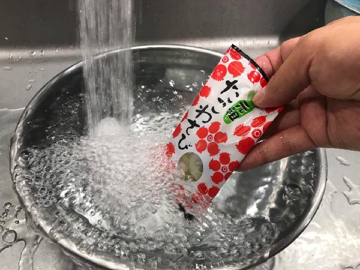 いいだこ(ベトナム、タイ)、山くらげ、しょう油、たん白加水分解物、食塩、砂糖混合ブドウ糖果糖液糖、白ワイン、マルトデキストリン、唐辛子、魚介エキス、茎わさび、粉わさび/ソルビット、調味料(アミノ酸等)、酒精、香料、増粘剤(キサンタンガム)、環状オリゴ糖、着色料(黄4、青1)、(一部に小麦・さけ・大豆を含む)