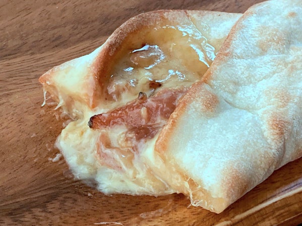 発酵種の風味がおいしいふんわり食感のピザ生地で、照り焼きチキンとゴーダチーズ、ステッペンチーズをなどを包み込みました。ワンハンドのスナックピザです。