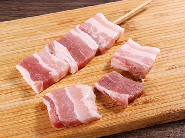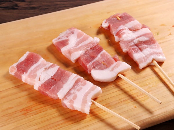 スライスした豚バラ肉をカットして、約3枚を15cm串で打ちました。