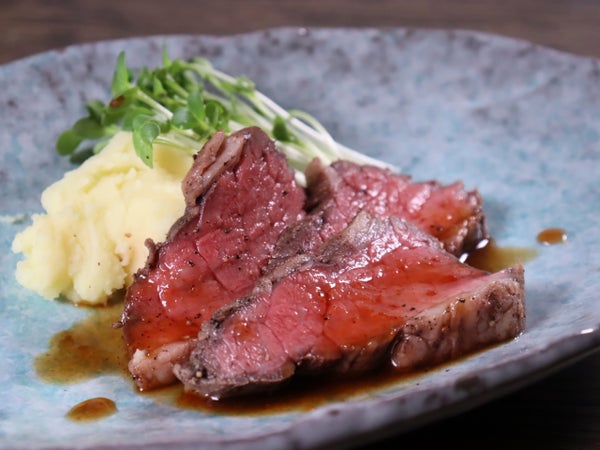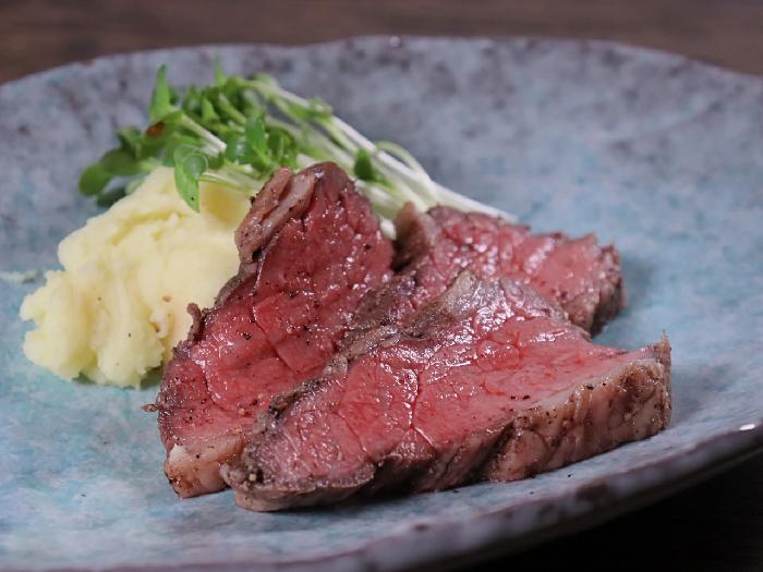 国産牛のブリスケ(前バラ)を使用したローストビーフです。旨み・コクが強い部位で、しっとりとして適度に脂があります。少量でも満足感のあるローストビーフです。