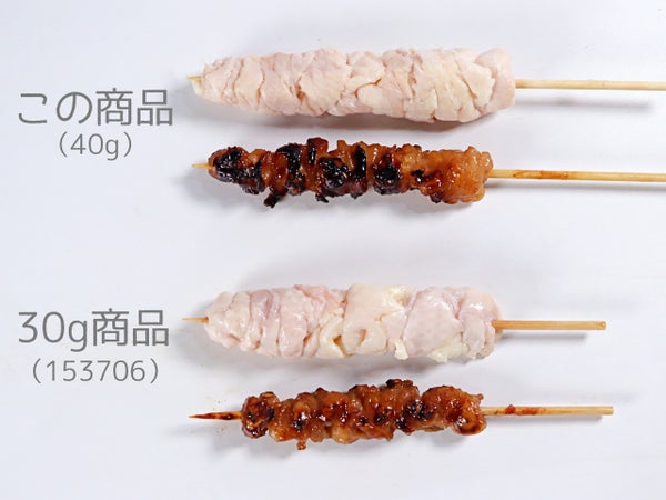 焼きとタレ付けを3回繰り返した例です。脂が落ちて皮が締まり、タレがしみ込んでいます。比較すると、この商品は首皮が薄くて焼き上がりの締まりがよく、しなやかな口当たりです。30g商品は首皮の厚みがあり、焼き上がりにむちっとした食感があります。(2025年5月時点のラインナップ比較です。