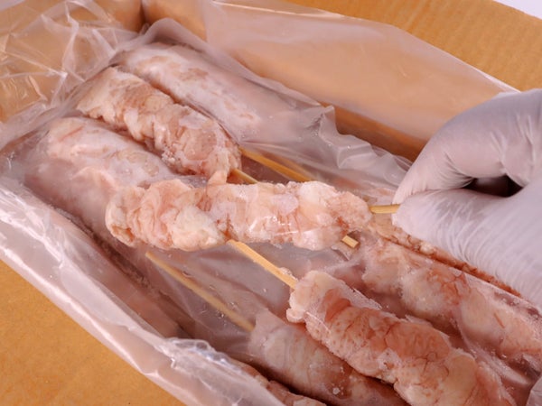 鶏皮を巻き付けるように串打ちしました。焼いて脂を落とし皮を引き締めながら、焼いて休ませてタレ付けして…を繰り返すことで、博多風の鶏皮串を作ることができます。タイ産の生の鶏首皮を使用し、現地工場で加工したものを輸入しています。