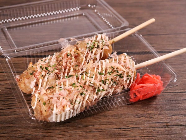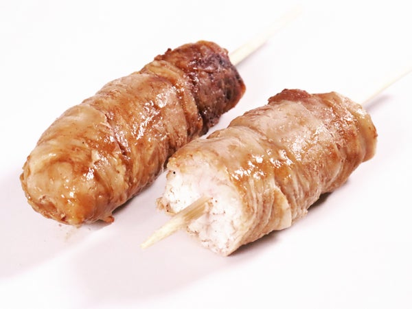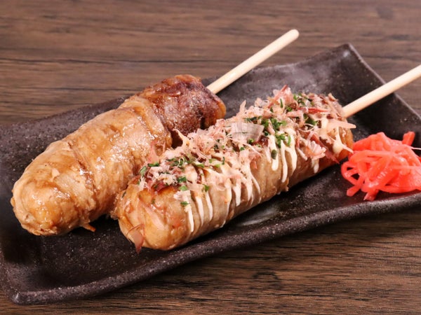 キャベツフレーク、紅ショウガ、イカ天、魚粉の入ったご飯を豚バラで巻きオーブンで焼いてから、お好みソースを絡めて仕上げた、串付き肉巻きおにぎり棒です。温めるだけで簡単に提供ができます。お祭りなどのイベントに最適です。