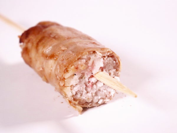キャベツフレーク、紅ショウガ、イカ天、魚粉の入ったごはんを豚バラで巻き、お好み焼き風のタレで仕上げてあります。