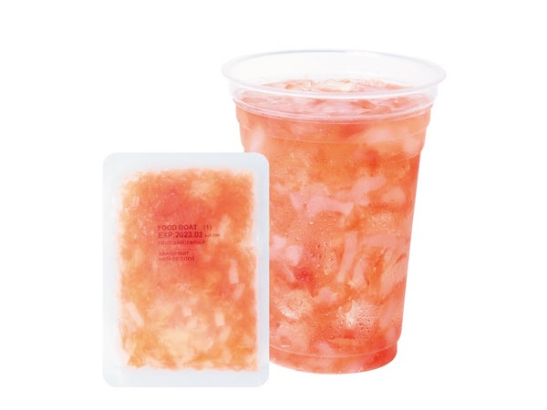 お好みのドリンク(紅茶・ジャスミン茶・炭酸水など)で割るだけで、果実感たっぷりのナタデココドリンクが作れるオールインワンパックです。冷凍のまま作るのがおすすめです。ストローで吸えるように小さくカットされたナタデココはほどなく解凍されてコリコリおいしく、半解凍状態の冷凍フルーツがシャリシャリしてフローズンドリンクのような味わいが楽しめます。