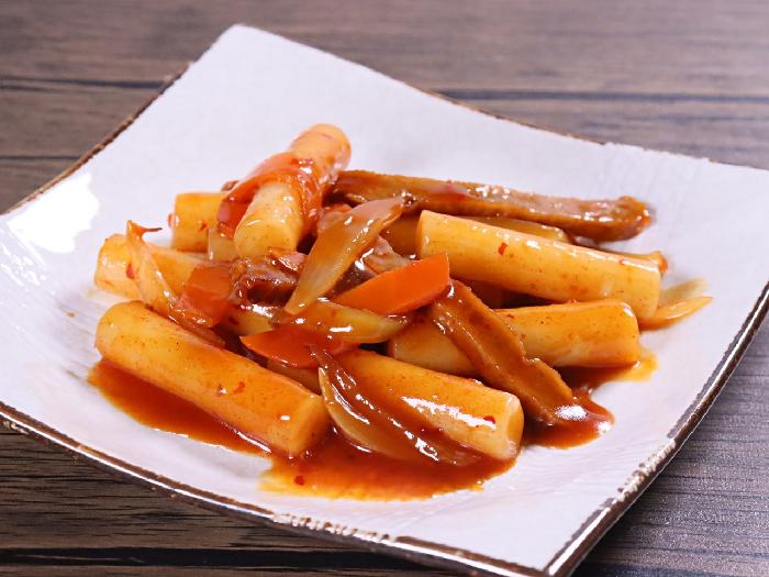白米が原料の棒状の餅です。程よい歯ごたえと、もちっとした食感が特徴です。玉ねぎやさつま揚げとピリ辛コチジャンだれで煮込めば完成です。