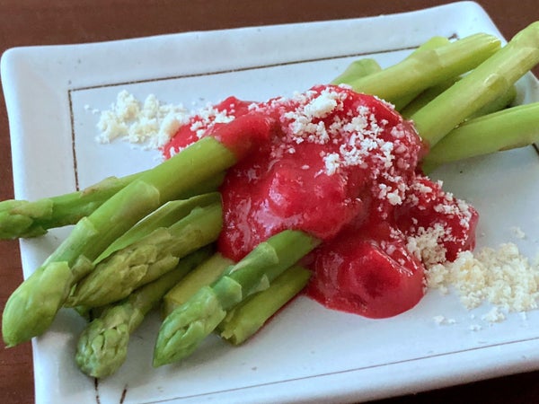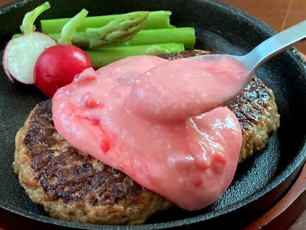動物性素材を使わず植物性素材だけで作った、ヴィーガンでも食べられる「プラントベース」食品です。真っ赤な国産ビーツ「こいあかね」を使用した、ビビッドな濃ピンク色のソースです。