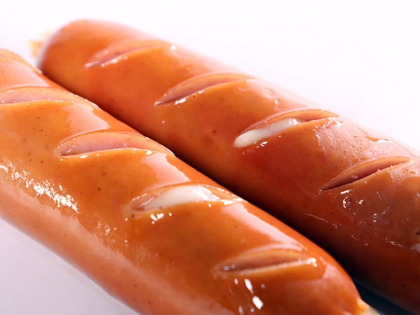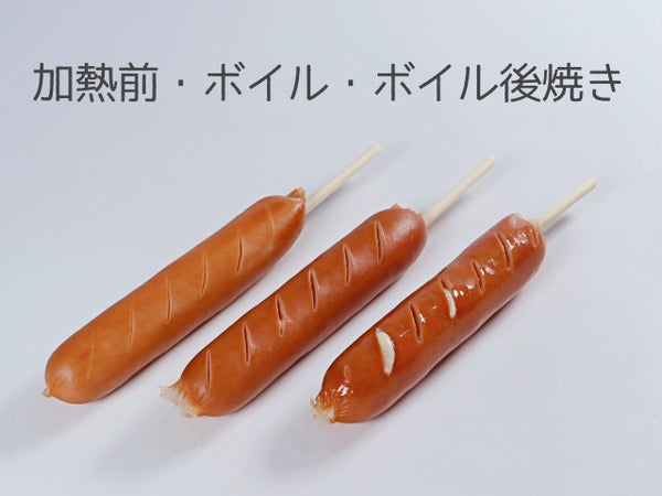 鶏・豚のフランクです。可食部分の長さは13~14cm程度の標準的サイズ。