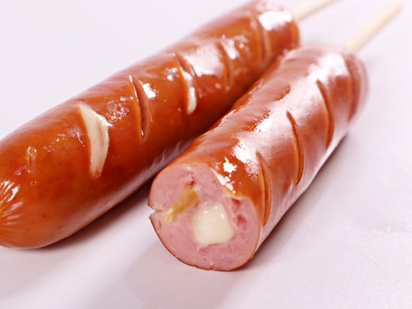鶏肉(国産)、豚肉、豚脂、プロセスチーズ、でん粉、還元水あめ、食塩、香辛料、たん白加水分解物、脱脂粉乳、卵たん白/加工デンプン、リン酸塩(Na)、乳化剤、くん液、調味料(アミノ酸)、保存料(ソルビン酸)、酸化防止剤(V.C)、発色剤(亜硝酸Na)、着色料(キビ色素、アナトー)、(一部に卵・乳成分・小麦・牛肉・大豆・鶏肉・豚肉を含む)
