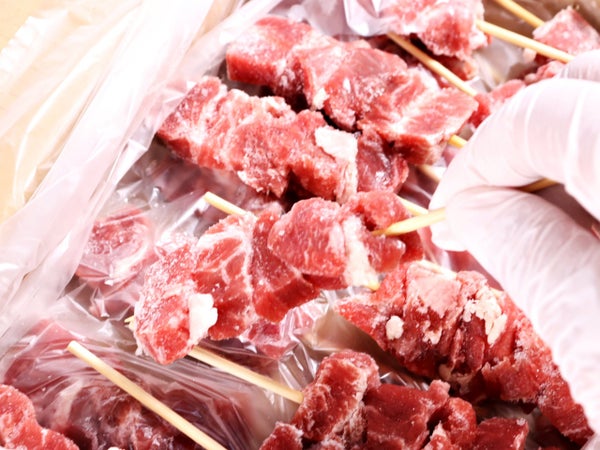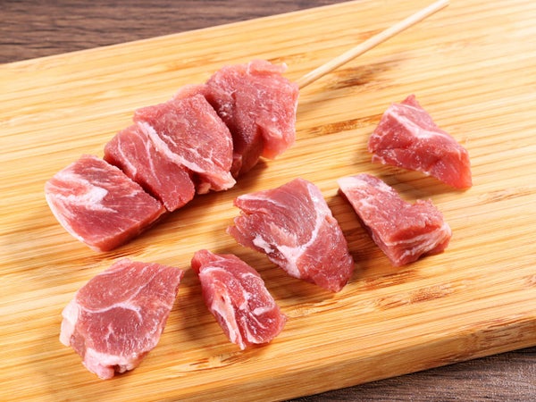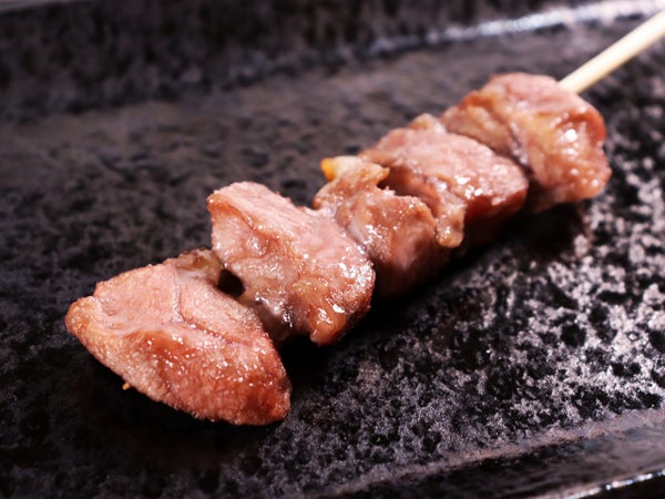 ほほからこめかみにかけた、豚の頭の肉です。カットして4~5個ほどを刺しています。