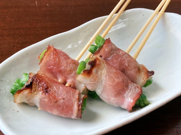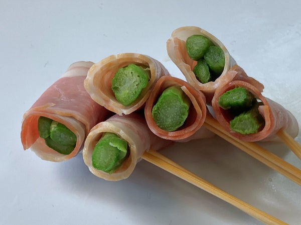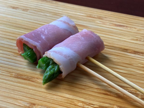 アスパラをベーコンで巻き、2貫串にしました。手間のかかる巻き串が仕込み不要で提供できます。