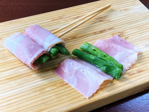 | アスパラ/ベーコン | 太アスパラ1本 | 細アスパラ数本/薄切りベーコン | アスパラ数本 | |||