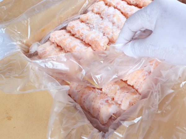 国産鶏肉のぼんちりを15cm串で6~7個刺しています。(定数ではないので前後する場合があります)