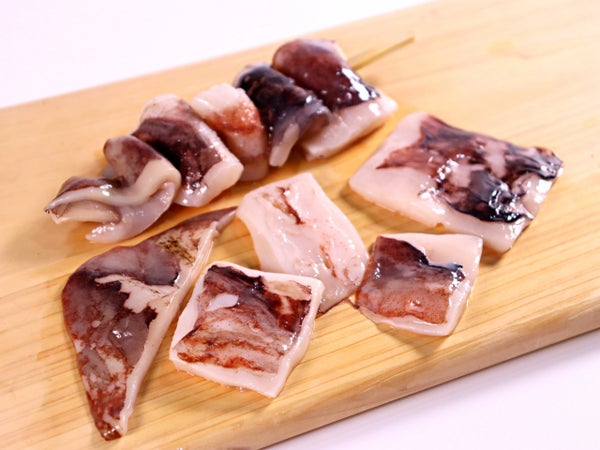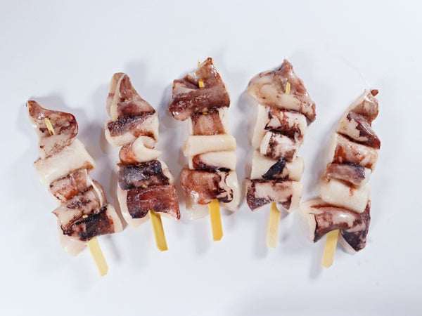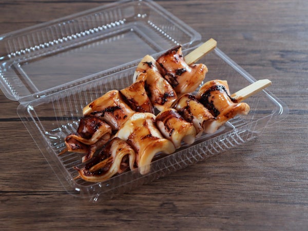 ペルーイカの身と耳の部分を5貫串にした、ボリュームのある一品です。ペルーイカを使う事でリーズナブルな価格に仕上げました。醤油やお好みのタレで味付けしてください。