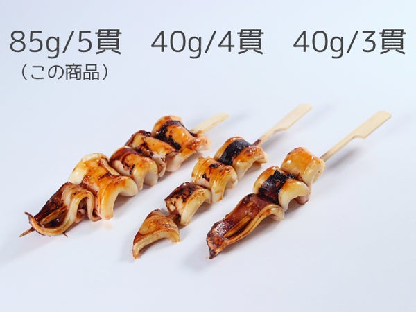 1本85g。肉厚で食べ応えのある胴4個にコリコリ歯ざわりの耳1個を、18cm鉄砲串で打っています。