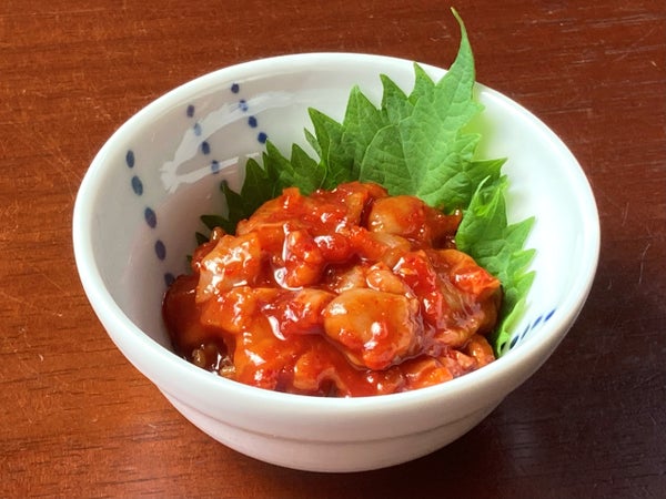 スケソウダラの内臓を唐辛子やニンニクなどを効かせたヤンニョムで漬け込み、たっぷり1ヶ月熟成させました。塩分や糖分は控えめにし、素材の味を活かしています。深みのある辛さとまろやかな甘みが特長です。