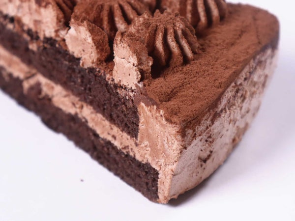 ビターなココアスポンジにチョコクリームを重ねて、背面にもしっかりデコレーション。