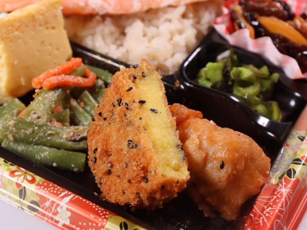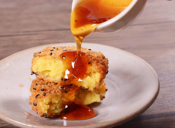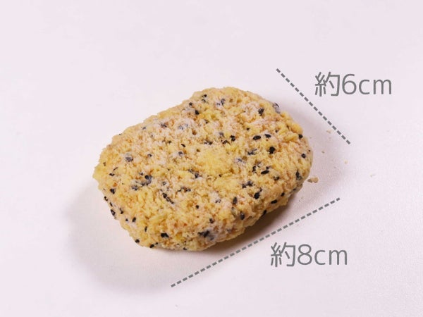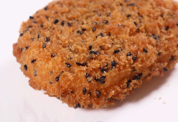 さつまいもと馬鈴薯を使用したほんのり甘めの具材に、北海道産小麦を100%使用したパン粉と黒ごまをまぶし、香ばしく仕上げました。大学芋をイメージした、珍しい黒ごま入りの衣です。