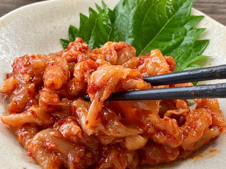 とにかく歯ごたえの強いタラ胃を味わえるチャンジャです。薬味をまぶしてすりこんだような仕上がりで、アミエビ塩辛の香ばしさとにんにくの風味を加えた、特徴的なチャンジャになっています。