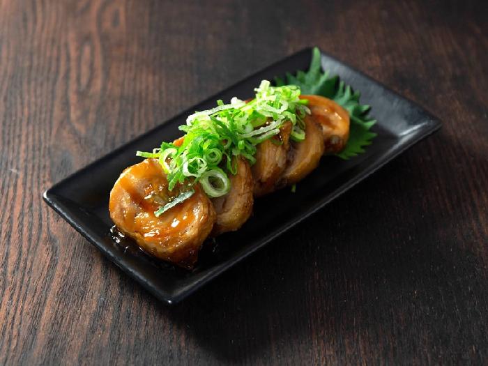 にんじん、いんげん、ごぼうを鶏もも肉で巻いて炭火焼にしました。醤油ベースのタレで味付けし、スライスしました。スライス済みなので解凍するだけで提供できます。