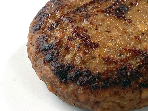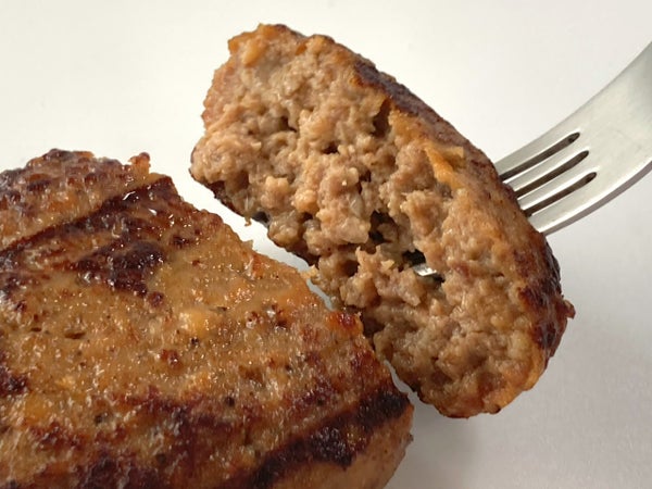 - ビーフ100%の肉々しさがありながら固くない、しなやかな焼き上がりになるように、肉の挽き方や成型の仕方にもこだわって製造されています。肉を切ったとき、口に入れたときに肉汁が感じられるように仕上げました。