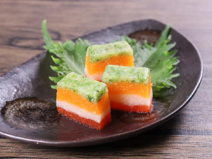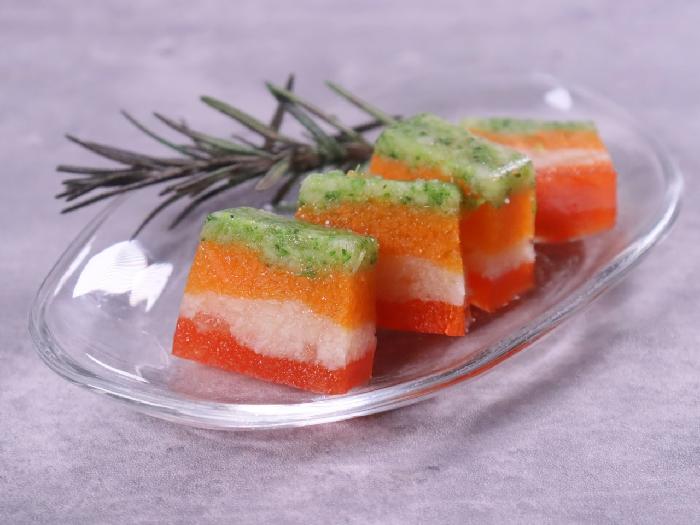 にんじん・ブロッコリー・カリフラワー・パプリカの4種類の野菜を丁寧にマリナードして野菜本来のうまみを引き出し、ミルフィーユ状のテリーヌに仕上げました。彩りのよい一品です。オードブルやお料理の付け合わせにお使いください。