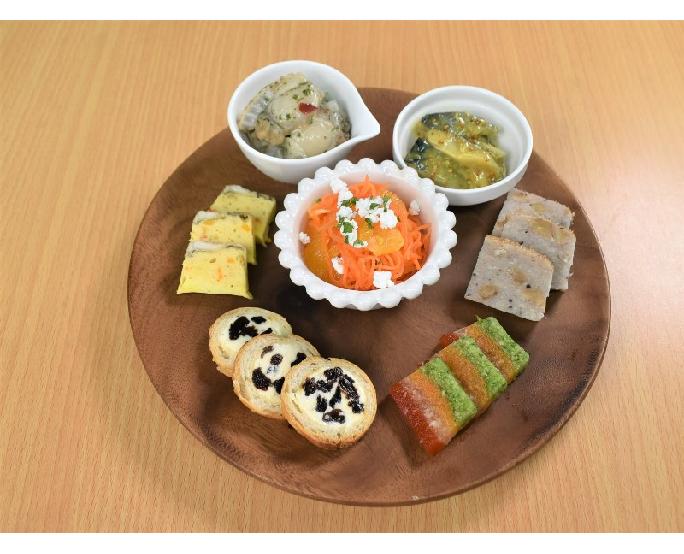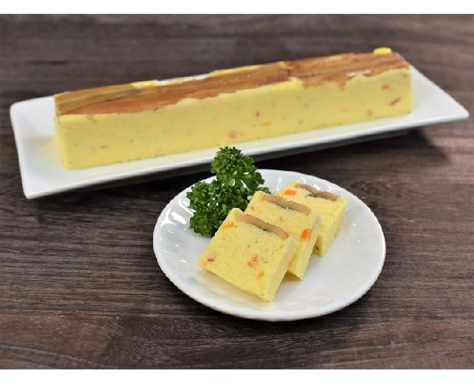 彩り野菜の甘みとサフラン風味を利かせたコクのある魚介ムースに、低温調理でふっくら仕上げたあなごを合わせたテリーヌです。オードブルやお料理の付け合わせにおすすめです。
