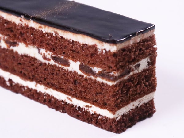 ココアスポンジとラムレーズン入りのクリームは3層。中央の層にラム酒漬けのレーズンをたっぷり挟んでいます。