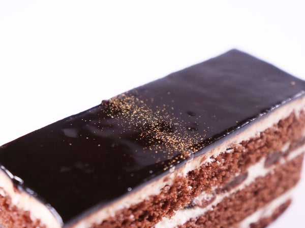 上面につややかなグラサージュチョコを重ね、ワンポイントに金粉を掛けました。